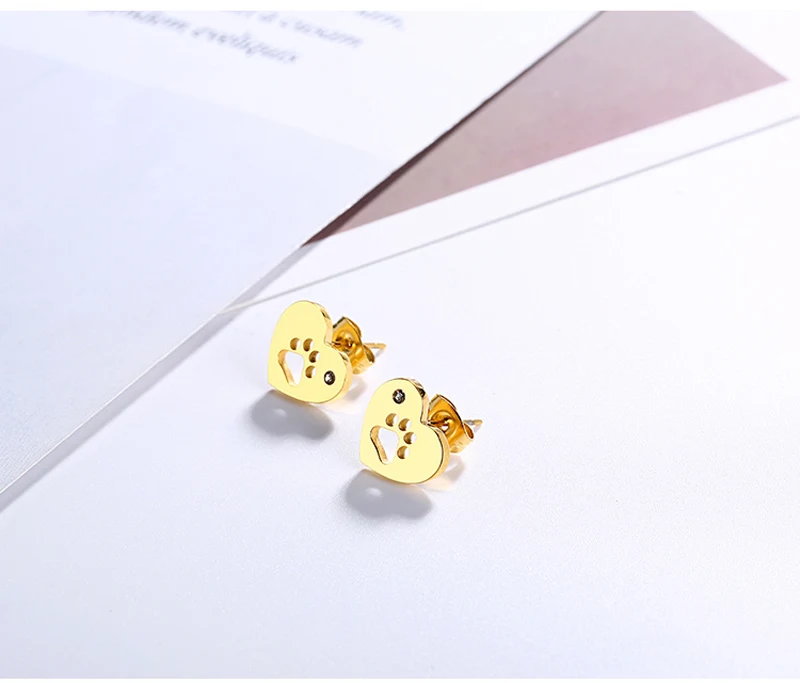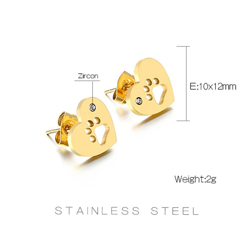 Серьги-гвоздики в форме сердца, циркон, нержавеющая сталь, полые серьги с принтом кошачьей лапы, Женские Ювелирные изделия, золотой, серебряный цвет, для любителей домашних животных, высокое качество
