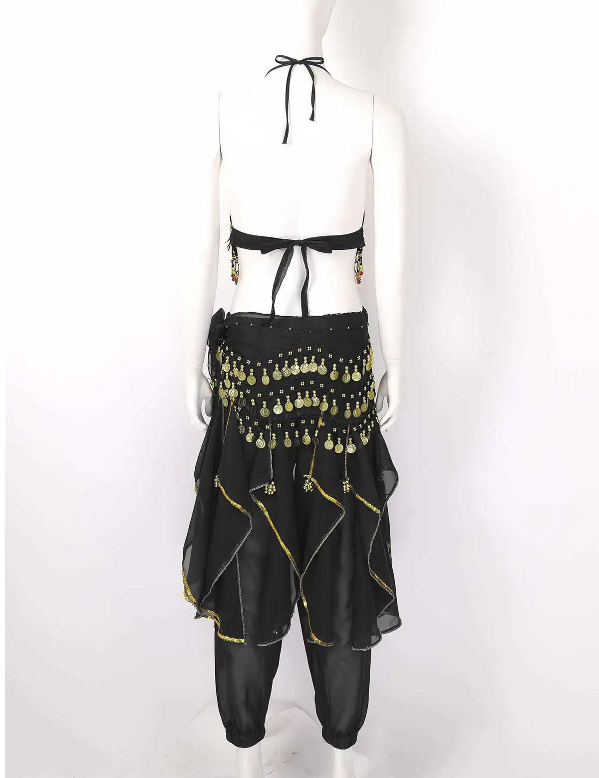 Halter neck padded top with stitched sequins, bells and beads, back tie up design for a better fit, elastic waistband harem pants with gold trim and beads, stretchy leg opening.
