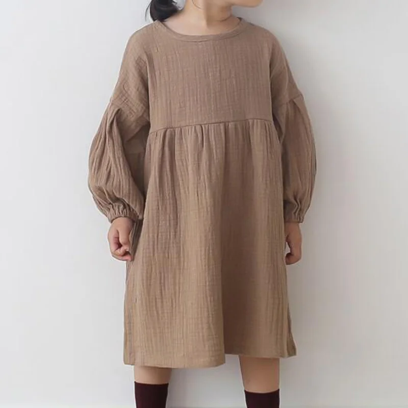 Корейские осенние платья для девочек повседневное хлопковое льняное платье с
