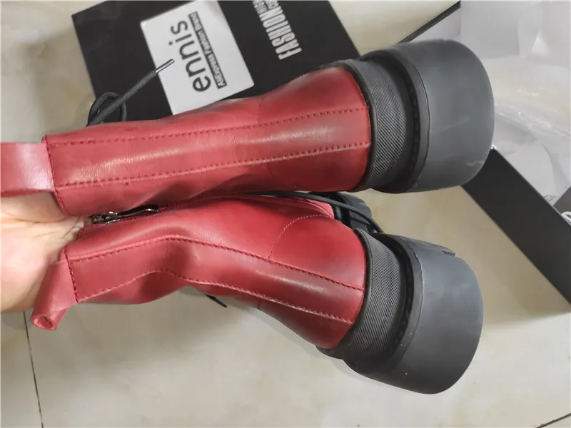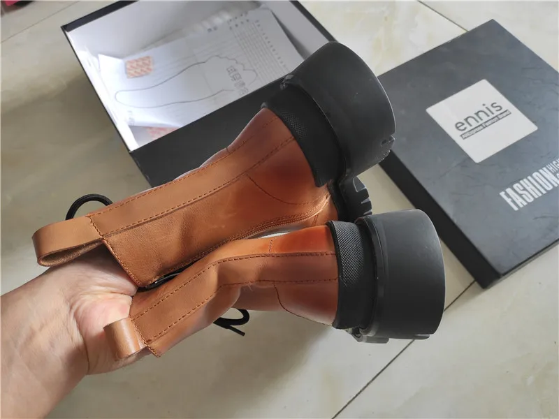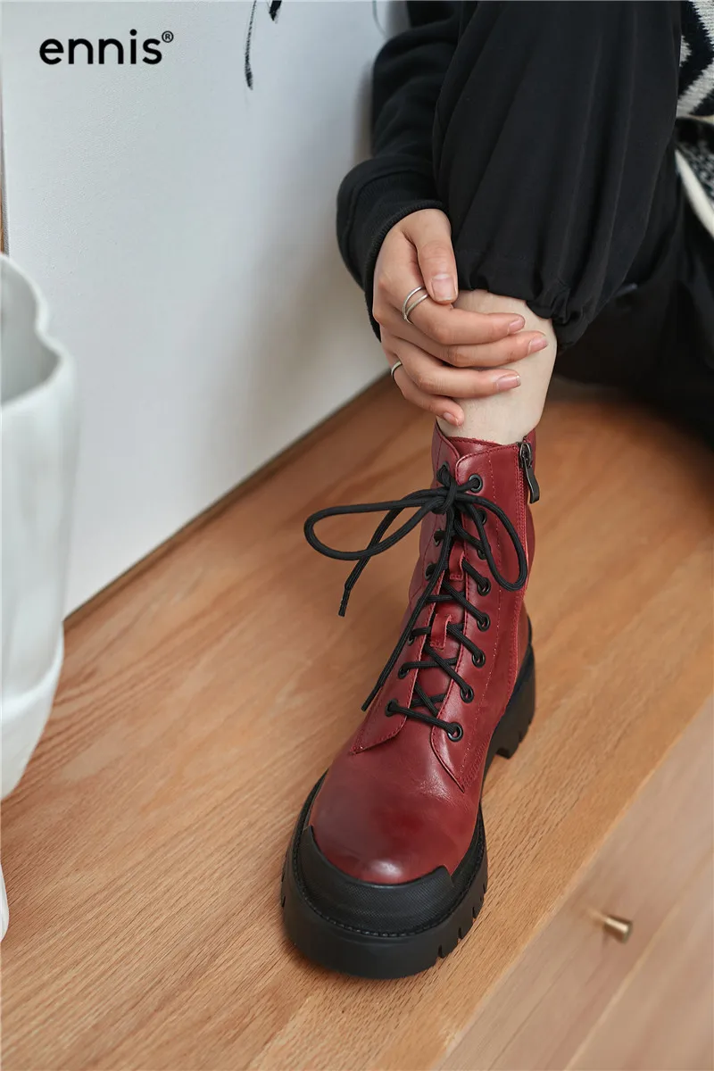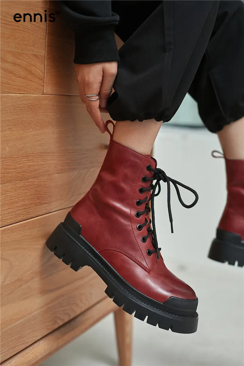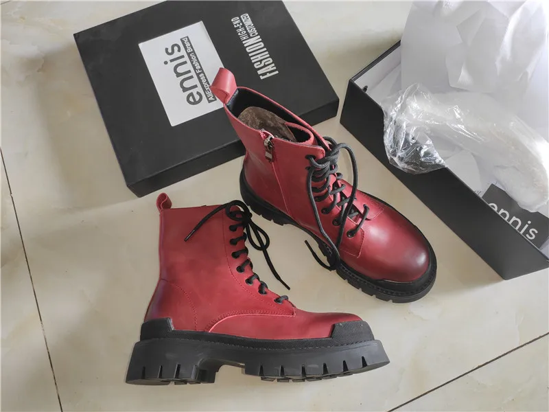 ENNIS/ботинки в стиле ретро; Женские ботильоны из натуральной кожи на платформе; Ботинки Martin на плоской подошве со шнуровкой; Цвет коричневый, красный; Сезон осень-зима; Новая мода; A0080 Верх: натуральная кожа Подкладка: микрофибра или теплый плюш Платформа: 5 см