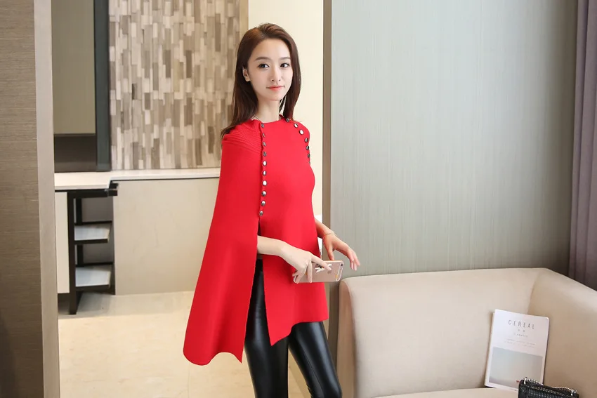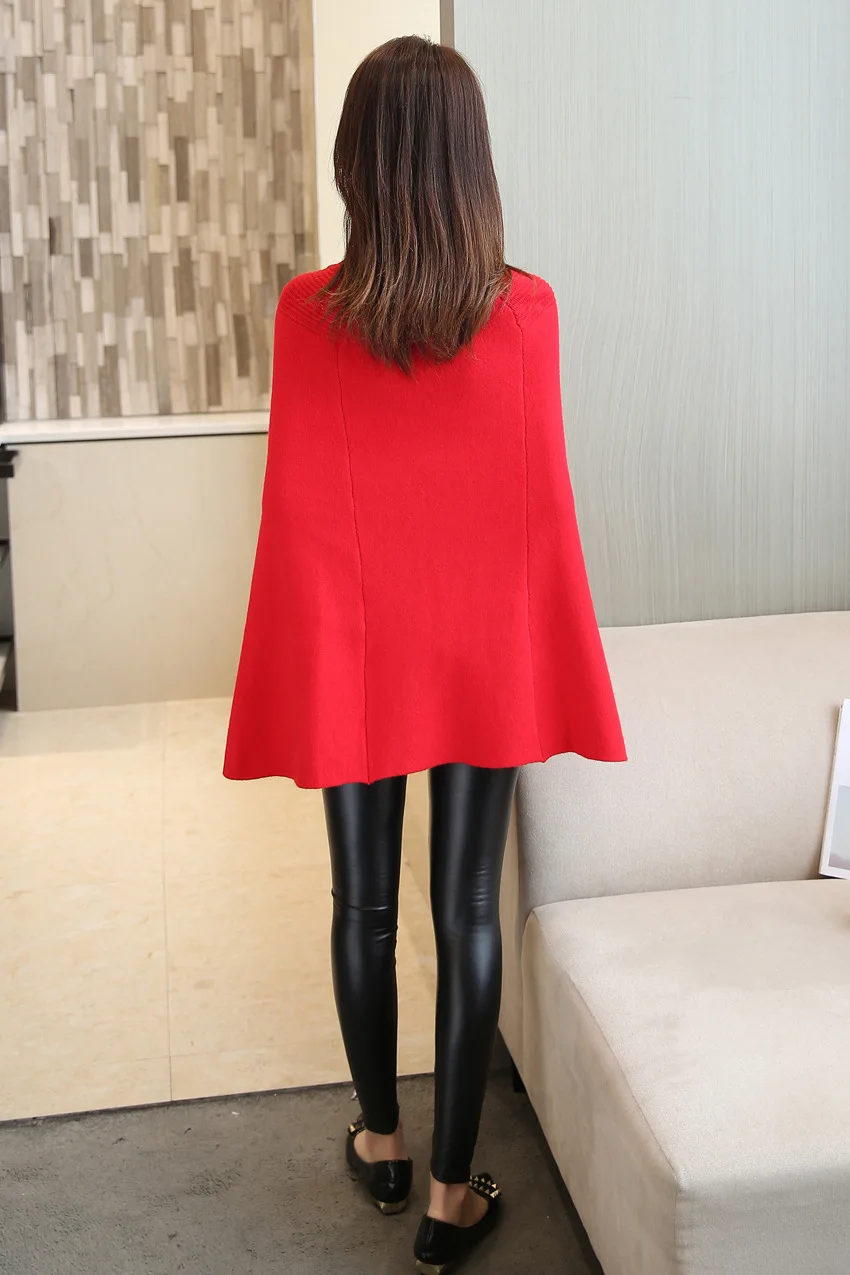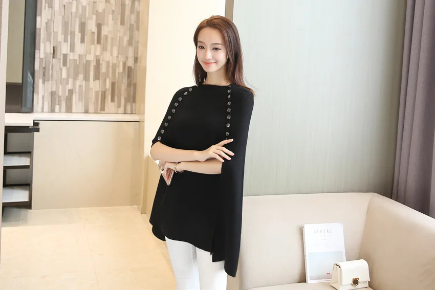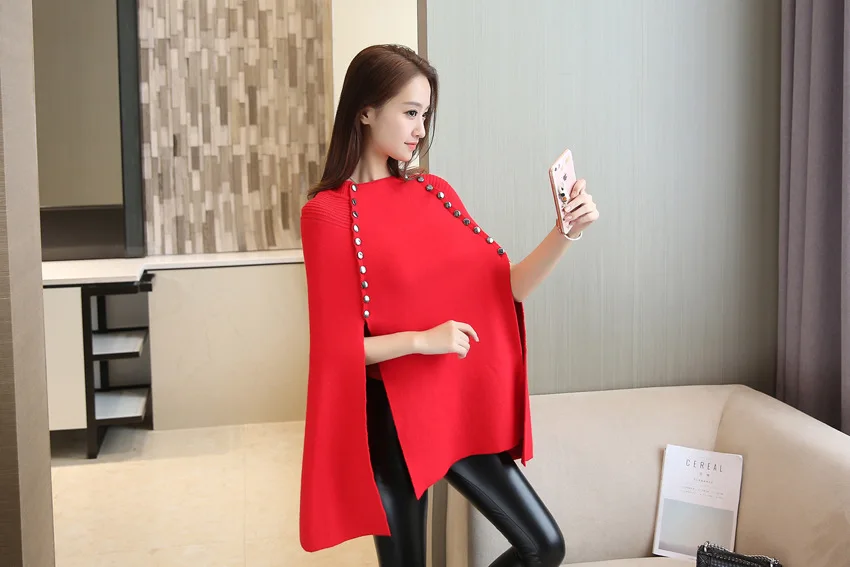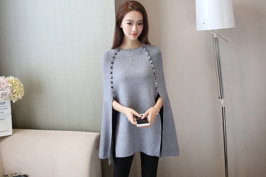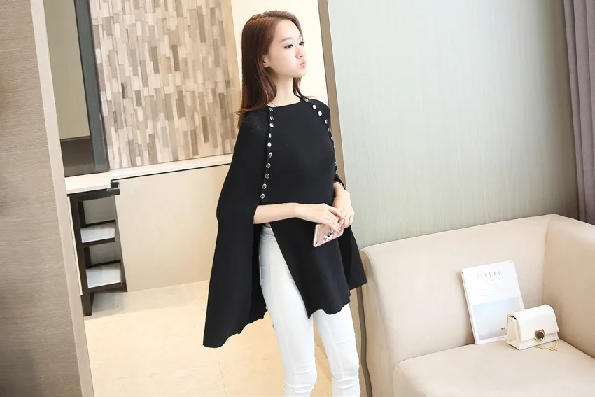 Женский двубортный плащ с рукавами «летучая мышь», свободное пончо 2020, Зимний вязаный длинный свитер, черный пуловер с заклепками, пальто