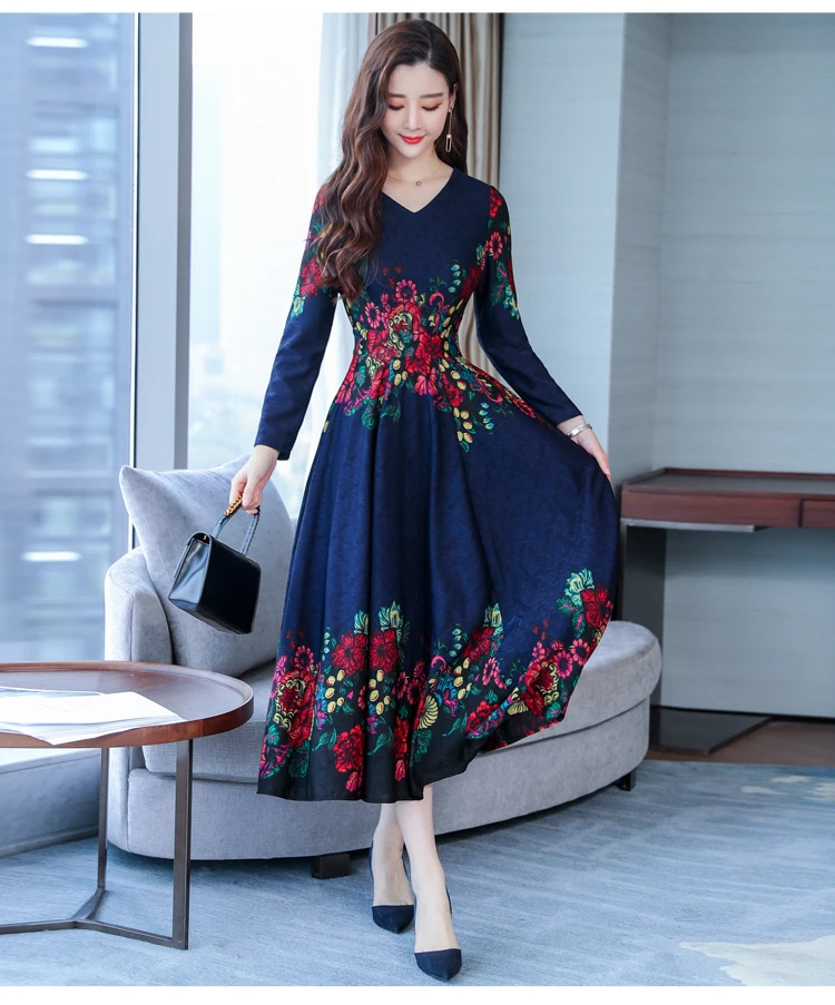 Женское платье с v-образным вырезом и принтом, лидер продаж, осенне-зимнее платье в стиле ретро с длинными рукавами, вечерние платья высокого качества размера плюс 5XL, DA227