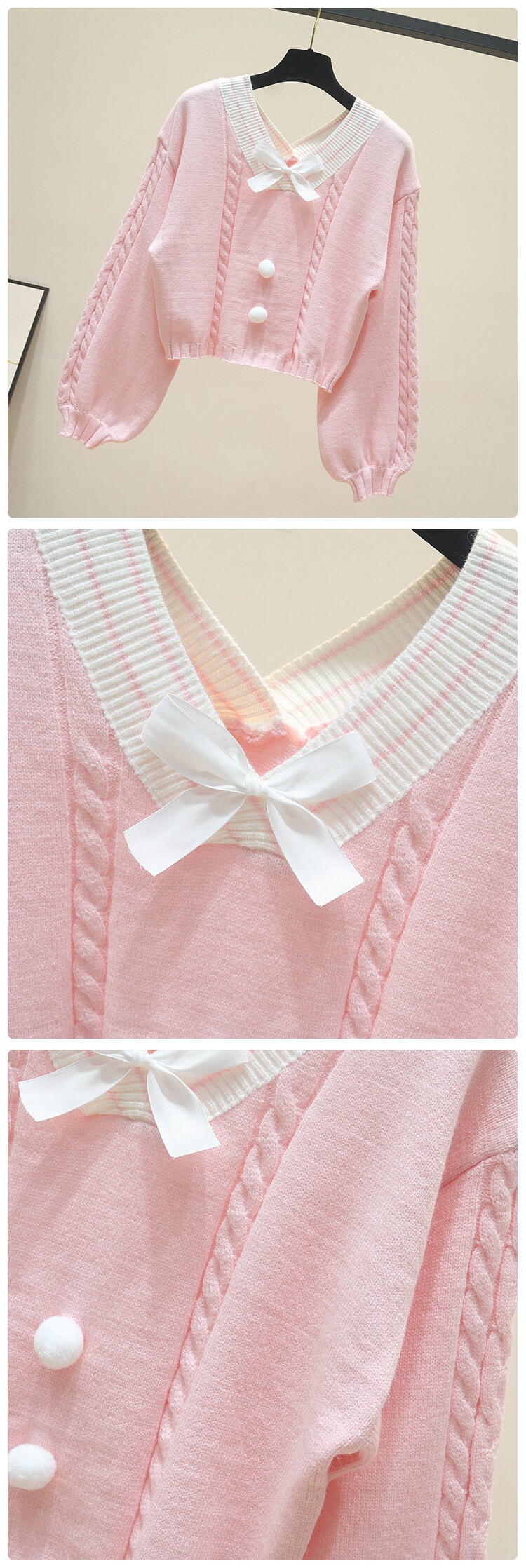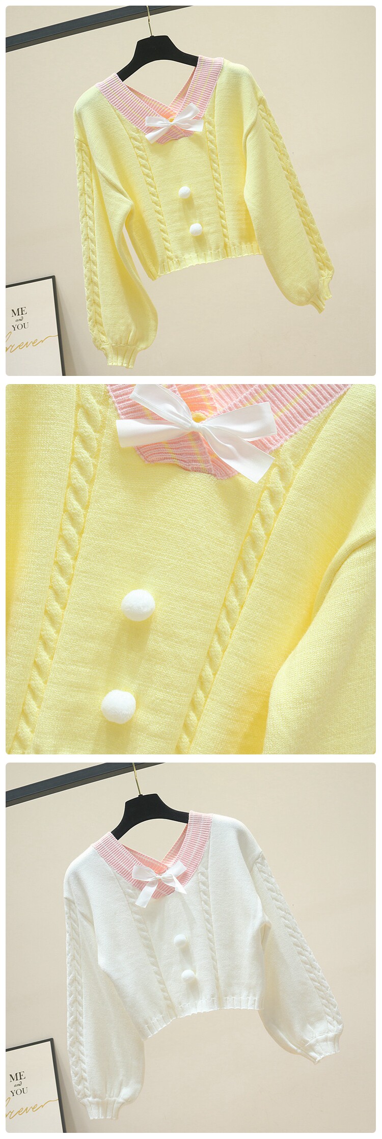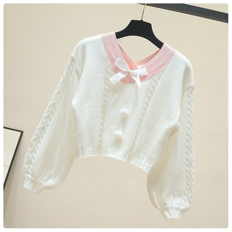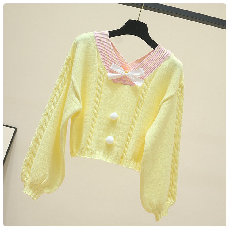 Весна-осень, новинка, женский милый короткий свитер с бантом, для девушек, студентов, Harajuku, Свободный пуловер с v-образным вырезом, Топ в стиле "преппи" Описание