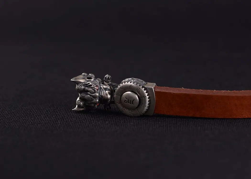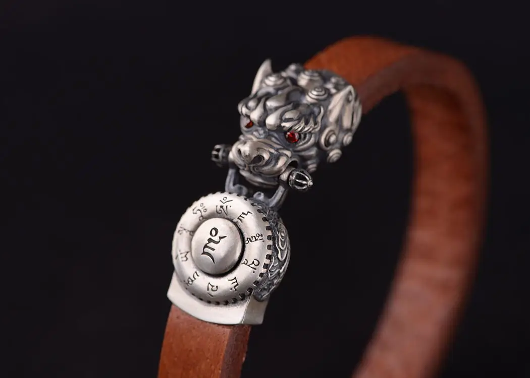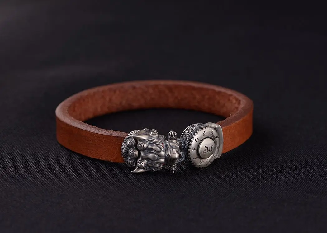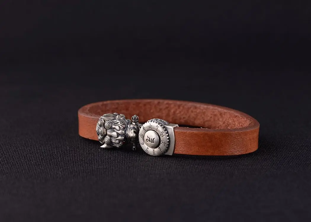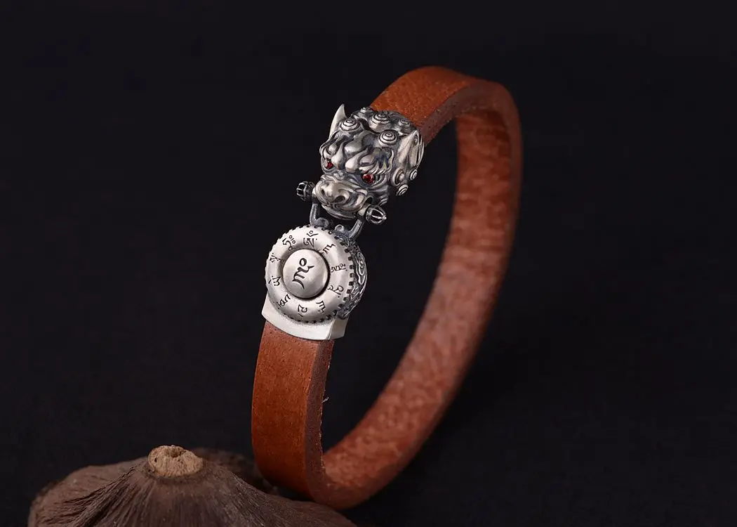 999 стерлингового тайского серебра ручной работы кожаный Веревка с серебром Pixiu и шесть символов браслет с мантрой для мужчин