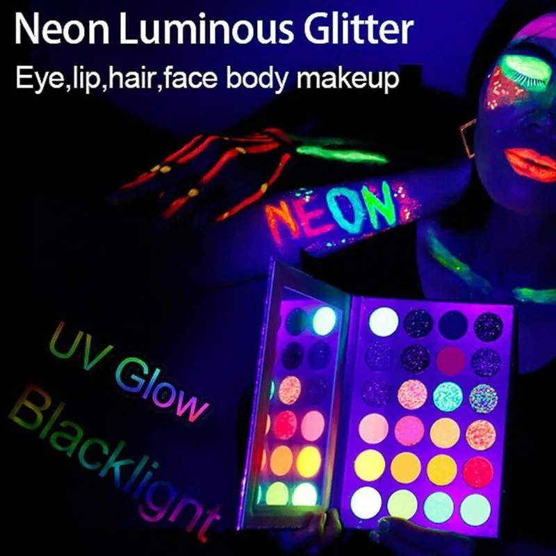 О товаре: 24 вида ярких цветных теней для век, в том числе 5 пятиконечных хлопьев-УФ-черный светильник можно использовать в любом месте для блеска. 5 матовых теней и 6 блестящих неоновых теней для век, ярко светящихся в темноте при УФ (ультрафиолете) освещении. При нормальном освещении светильник цвета как красивые, так и яркие, но только излучают светильник, когда есть УФ/черный светильник.