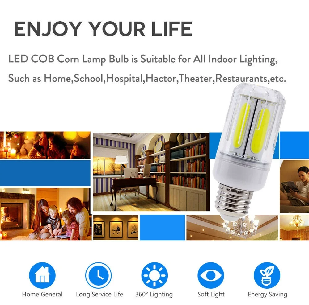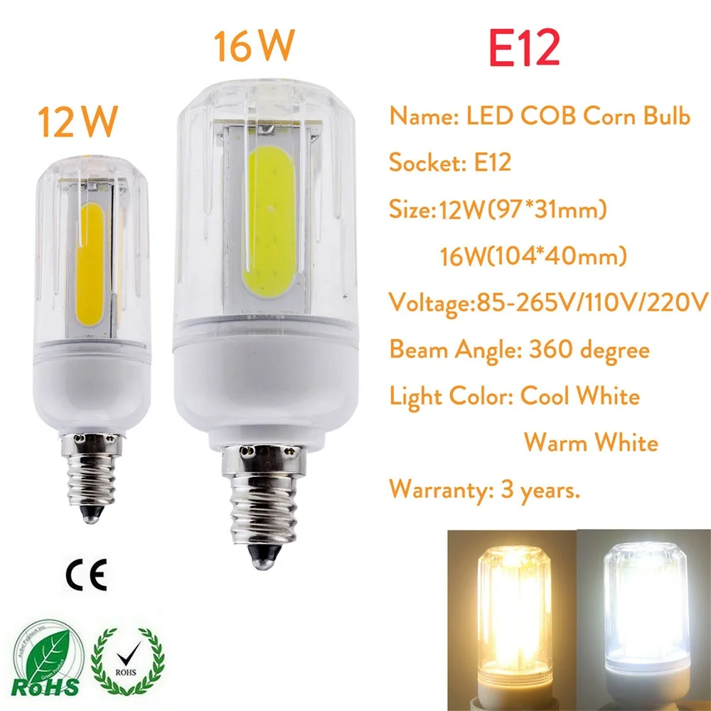 Модель: COB светодиодный кукурузные лампы Тип цоколя: E27,E26,E14,E12,B22 Мощность: 12 Вт/16 Вт Напряжение: 85-265 в (100 в 110 в 120 в 130 в 220 В 230 в 240 В) Люмен: 550-700 лм Цветовая температура: Дневной свет (холодный белый): 6000-6500k; Мягкий белый (теплый белый): 2700-3200k CRI: >75 RH Срок службы: более 50 000 часов Сертификация: CE & ROHS Гарантия: 3 года