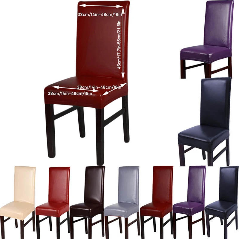 1. Цвет: темно-красный, фиолетовый, серый, черный, кофейный, бежевый, красный 2. Материал: искусственная кожа 3. Размер: Высота спинки стула может быть от 45 до 55 см, ширина спинки стула может быть от 38 до 48 см, длина сиденья стула может быть от 38 до 48 см, ширина сиденья стула может быть от 38-48 см 4. Упаковка включает: 1 × Чехлы для стула