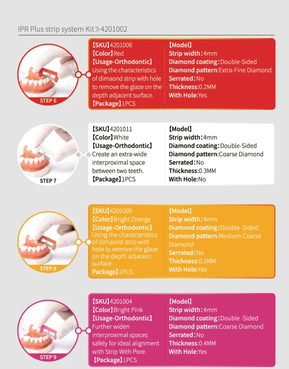 Easyinsmile IPR Plus strip system-это инновационная интерпроксимальная система уменьшения, которая делает межпроксимальную эмаль зачистки безопасной и точной, не создавая острых углов или поджиганий. Дизайн импортированной гибкой алмазной поверхности предназначен для использования с Invisalign®И другие Ортодонтические процедуры invisalign. Из-за изогнутой поверхности зуба гибкая конструкция может постепенно увеличивать поверхность воротника в зависимости от разной толщины для эффективного одевания, избегайте образования шагов после де глазури зубов и влияния эффекта закрытия. В то же время дизайн пильного банта соответствует эргономике и механике, что повышает эффективность работы. Эти гибкие алмазные полоски изгибаются и соответствуют естественным контурам зубов, чтобы максимизировать комфорт и безопасность пациента.