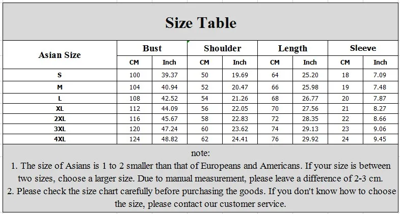 Размеры стол Азиатский размер; Обхват груди; Длина плеча; Рукав ; См; Дюйм; S 100 39,37 50 19,69 64 25,20 18 7,09 M 104 40,94 52 20,47 66 25,98 19 7,48 L 108 42,52 54 21,26 68 26,77 20 7,87 XL 112 44,09 56 22,05 70 27,56 21 8,27 2XL 116 45,67 58 22,83 72 28,35 22 8,66 3XL 120 47,24 60 23,62 74 29,13 23 9,06 4XL 124 48,82 62 24,41 76 29,92 24 9,45 "Примечание: 1. Размеры азиатов на 1-2 меньше, чем у европейцев и американцев. Если ваш размер находится между двумя размерами, выберите больший размер. Из-за ручного измерения, пожалуйста, оставьте разницу в 2-3 см. 2. Пожалуйста, внимательно проверьте таблицу размеров перед покупкой товара. Если вы не знаете, как выбрать размер, пожалуйста, свяжитесь с нашей службой поддержки клиентов."