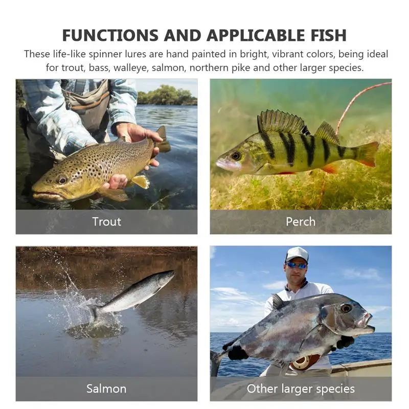 Это набор рыболовных Блесен, ярких и реалистичных. Дизайн симуляции с изысканными деталями и острым крючком разработан для удовлетворения ваших желаний рыбалки. Яркие цвета легко привлекают большую рыбу. Идеально подходит для океана, озера, водохранилища, пруда и реки. Идеально подходит для людей, которые хотят поймать различные рыбы и т. Д. Это отличный подарок для любого новичка или привыкание рыболовов.