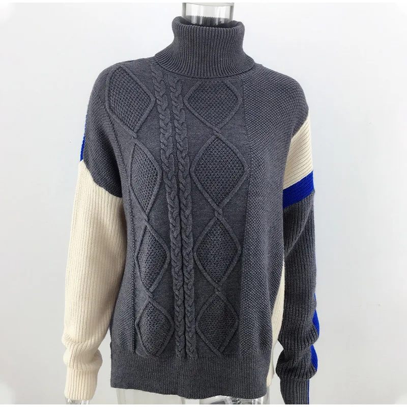 Женский вязаный свитер в стиле пэчворк, свитер с высоким воротником и длинным рукавом, женские свитера с разрезом, осень 2020, модная женская повседневная одежда