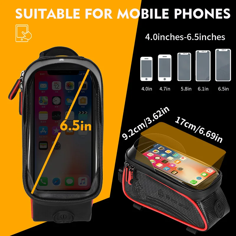 Наименование товара: велосипедная верхняя сумка Материал: ЭВА + ПУ Функция: Непромокаемая модель Вес: около 250 г Сумка для телефона подходит для: менее 7,0 дюймов телефона Место для хранения: можно носить инструменты, кошелек, ключи, перчатки и так далее Сенсорный экран: TPU Sensitive Особенность: водонепроницаемый; Износостойкий, солнцезащитный