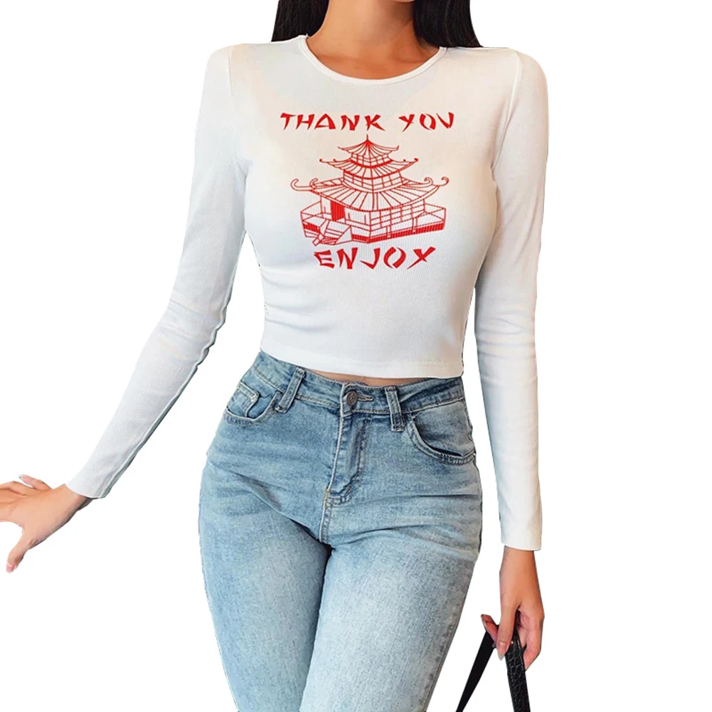 Женская приталенная блузка, базовая Укороченная рубашка с длинными рукавами и круглым вырезом с буквенным принтом