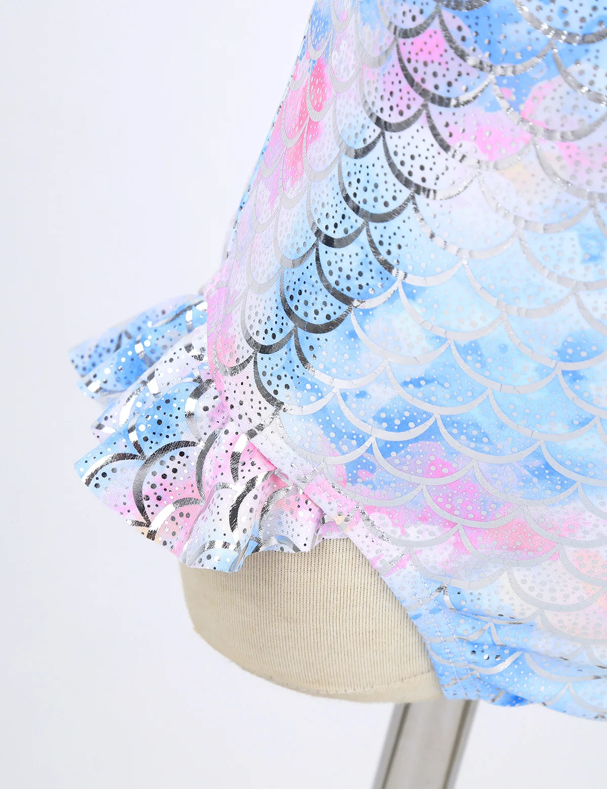 Без рукавов, крест-накрест на спине с вырезом, повторяющийся принт с блестящим рисунком рыбьей чешуи. Отверстия для ног украшены рюшами.